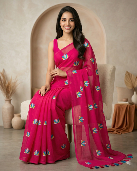 PINK LOTUS EMBROIDERED MUL COTTON SAREE