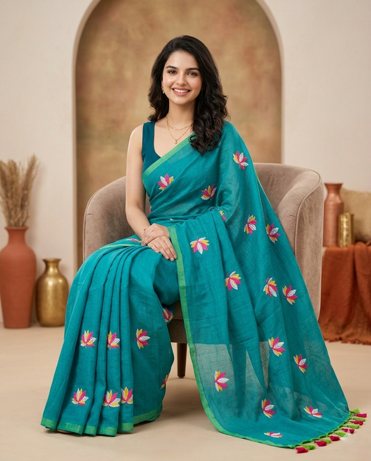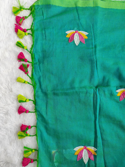 SEA GREEN LOTUS EMBROIDERED MUL COTTON SAREE