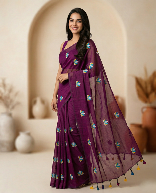 PURPLE LOTUS EMBROIDERED MUL COTTON SAREE