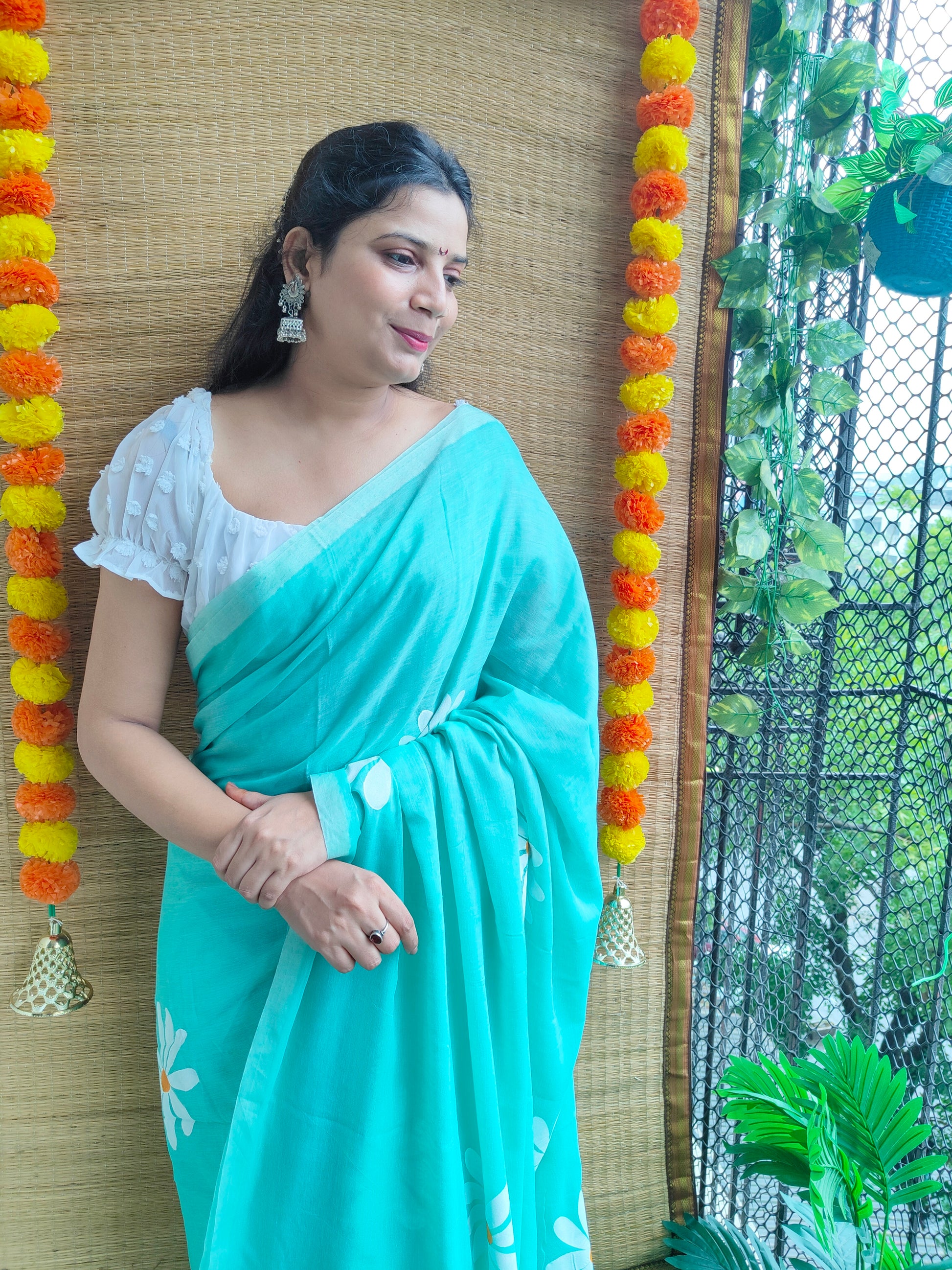 TURQUOISE BLUE FLORAL HAND PAINTED MUL COTTON SAREE